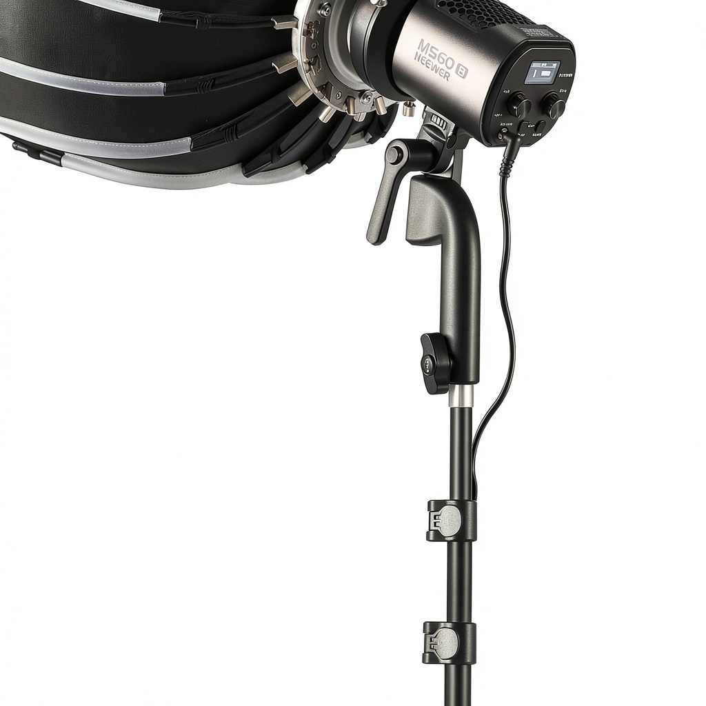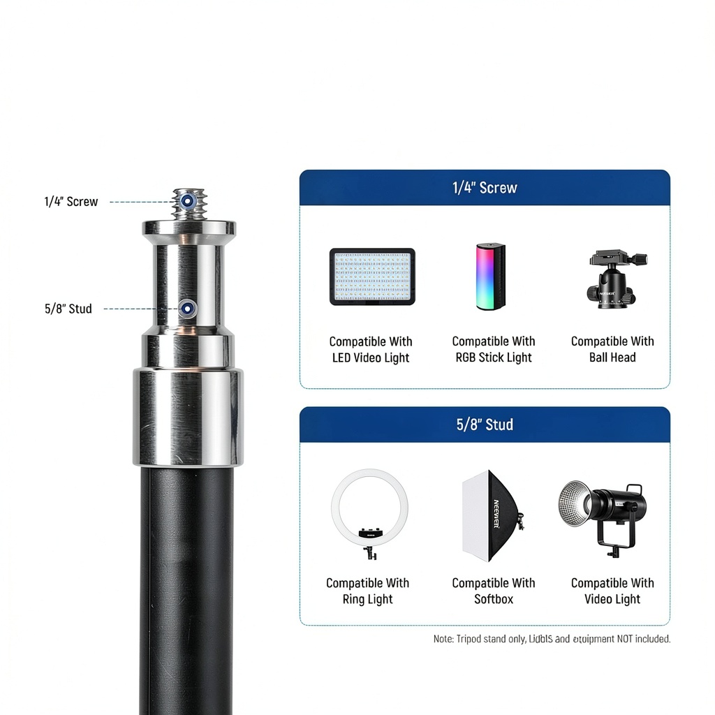 It works with softboxes, LED video lights, ring lights, flash speedlights, reflectors, phone mounts, and DSLR cameras using the standard 1/4″ screw.
