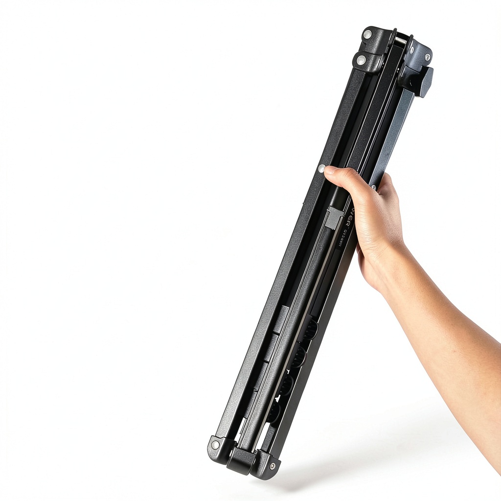 With its reverse-folding legs, the tripod collapses flat to save space, ideal for carrying in bags during travel.