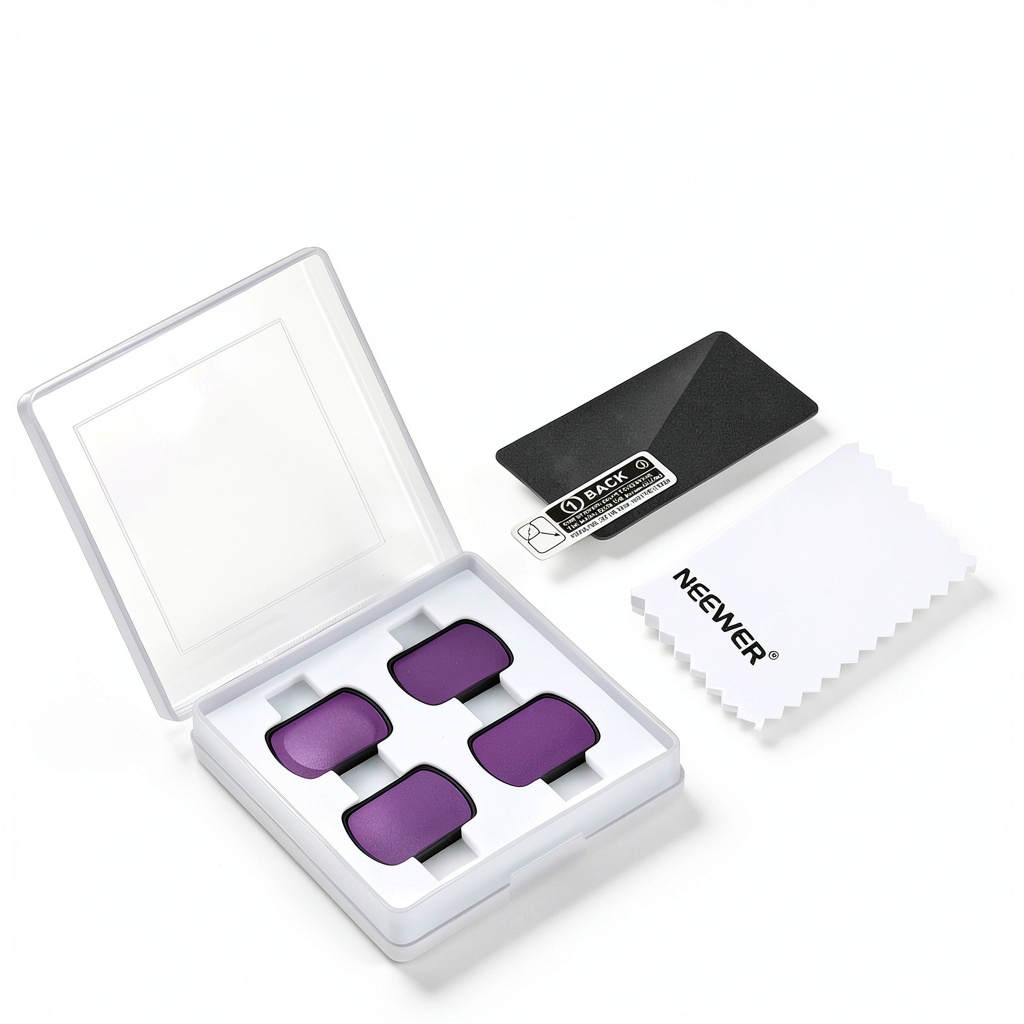 The Neewer Pocket 3 ND4-32 Magnetic Kit is a specialized set of four neutral density filters (ND4, ND8, ND16, ND32) engineered exclusively for the DJI Osmo Pocket 3 Gimbal Camera and its Creator Combo. Crafted from premium HD optical glass, these filters ensure authentic color reproduction without chromatic aberration or distortion. Each filter reduces light by specific stops—ND4 by 2 stops, ND8 by 3 stops, ND16 by 4 stops, and ND32 by 5 stops—allowing precise exposure control. The kit features multilayered nanometer coatings on both sides for resistance to water, oil, dust, scratches, and fingerprints, and includes a cleaning cloth for maintenance. With a convenient magnetic attachment system, the filters snap securely onto the camera without tools, preserving gimbal calibration and portability.